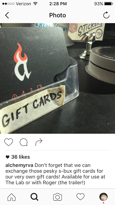 One of Alchemy's most prominent campaigns promoted via social media was their "Exchange giftcards." Alchemy would exchange giftcards from corporate coffee brands for one of their own gift cards.